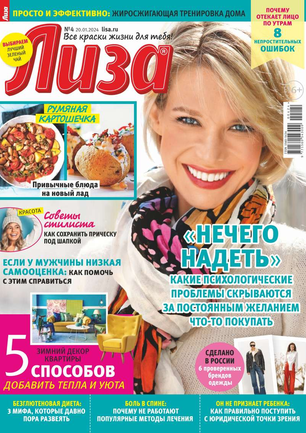 Самый популярный в России еженедельный журнал для молодых женщин «Лиза» стал еще интереснее, еще привлекательнее для читательниц. Теперь больше знаменитостей на страницах любимого журнала! Фитнес со звездой и звездный макияж, уроки стиля и самые горячие новости из жизни кумиров. А еще — модный шопинг, актуальная мода, новинки косметики и великолепные идеи для дома. Романтические истории о настоящей любви и рассказы читательниц о разных жизненных ситуациях. Аспекты психологии, секреты успешных отношений с окружающими и искусство сохранения любви.