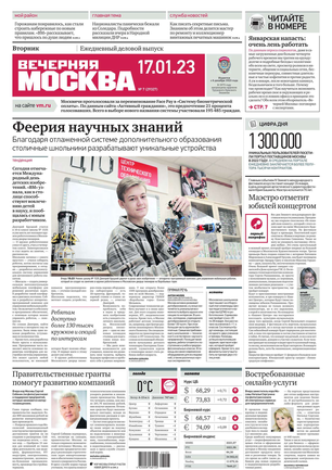 «Вечерняя Москва» — ежедневная российская вечерняя газета, старейшее из вечерних изданий в России, учрежденное в 1923 году. Выходит пять дней в неделю, кроме субботы и воскресенья. Отличается тем, что рассказывает о событиях еще не завершившегося дня. Оперативно освещает хронику и особенности жизни Москвы, охватывает все слои общества и большинство профессиональных и возрастных групп читателей.Издание представлено тремя выпусками – утренним ежедневным, вечерним (выходит три раза в неделю), еженедельным (выходит по четвергам).