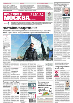 «Вечерняя Москва» — ежедневная российская вечерняя газета, старейшее из вечерних изданий в России, учрежденное в 1923 году. Выходит пять дней в неделю, кроме субботы и воскресенья. Отличается тем, что рассказывает о событиях еще не завершившегося дня. Оперативно освещает хронику и особенности жизни Москвы, охватывает все слои общества и большинство профессиональных и возрастных групп читателей.Издание представлено тремя выпусками – утренним ежедневным, вечерним (выходит три раза в неделю), еженедельным (выходит по четвергам).