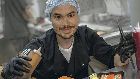 Курьеры с сумками-холодильниками цвета свежей моркови. Оранжевые стены на крутой лестнице. Багряный лосось на разделочной доске. Предприниматель Александр Мутовин встречает меня в офисе компании «Много лосося» и моментально погружает в «оранжевое настроение». Правую часть лофта занимает зона открытой кухни. Здесь в режиме реального времени ставят кулинарные эксперименты и готовят ланчи и закуски для себя. Тут же неподалеку стоят рядами деревянные столы, за которыми сидят сотрудники с ноутбуками. «У нас очень уютно, а там — зона, где мы по вечерам в нарды с ребятами играем», — объясняет Мутовин. Мы располагаемся в переговорной. Прозрачная дверь, большой и мягкий угловой диван, подушки, длинный стол — словно в лаунж-зоне городского кафе. На Александре белый худи с рисунком. Он улыбается. Рассказывая о бизнесе, постоянно использует прилагательное «кайфовый»: лосось, рис, офис. Мне нравится блеск и азарт в его глазах, когда он говорит о бизнесе, задачах по оптимизации процессов. Через два дня после интервью он уедет на рыбалку в Тыву, где проведет почти десять дней без связи наедине с природой. Для него это обычная история, последние семь лет Мутовин постоянно рыбачит и ловит кого-то из лососевых — ленка, хариуса, омуля — в Арктике, на Дальнем Востоке, на плато Путорана, на Камчатке. «Люблю свежую рыбу, ее же есть можно сразу, особенно в таких местах. Ты просто ножом разрезаешь, соли сыпанул чуть-чуть и ешь. И все безопасно, никакого описторхоза, ничего», — объясняет Мутовин. И добавляет: «Еще она пахнет соленым огурцом, который разжигает аппетит».