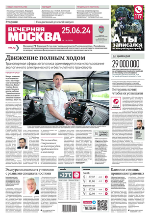 «Вечерняя Москва» — ежедневная российская вечерняя газета, старейшее из вечерних изданий в России, учрежденное в 1923 году. Выходит пять дней в неделю, кроме субботы и воскресенья. Отличается тем, что рассказывает о событиях еще не завершившегося дня. Оперативно освещает хронику и особенности жизни Москвы, охватывает все слои общества и большинство профессиональных и возрастных групп читателей.Издание представлено тремя выпусками – утренним ежедневным, вечерним (выходит три раза в неделю), еженедельным (выходит по четвергам).