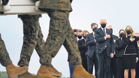 «На караул!» — звучный приказ командира словно разрезал тишину траурной атмосферы в городе Довер (штат Дэлавер), куда президент США и другие руководители страны прибыли, чтобы проститься с военнослужащими, погибшими в результате терактов в Кабуле. Высокие гости приложили руки к сердцам, и шестеро солдат понесли гроб из самолета в черный катафалк.